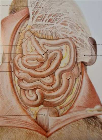 Tomtarmen – jejunum. Mellan delen, den viktigaste delen av tunntarmen, här spjälkas och absorberas näringsämnen såsom proteiner, fett, kolhydrater, vitaminer osv. Här absorberas näringen ut i blodbanan och lymfsystemet. Mycket vätska absorberas även ut här.